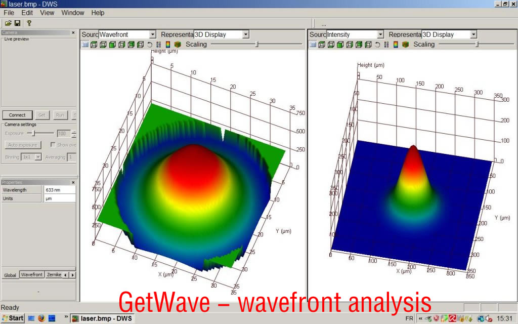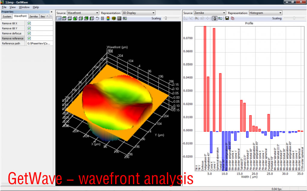 我们的传感器配有GetLase® 用于所有激光束参数和GetWave®的即时诊断的GUI软件图形用户界面软件与全面的波前分析工具,包括,Zernike,MTF和PSF。已成功用于以下应用程序: